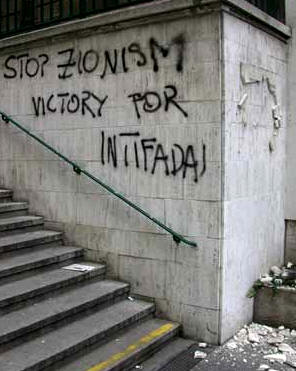 mit "Stop Zionism Victory for Intifada" beschmiert und die Herzl-Gedenktafel