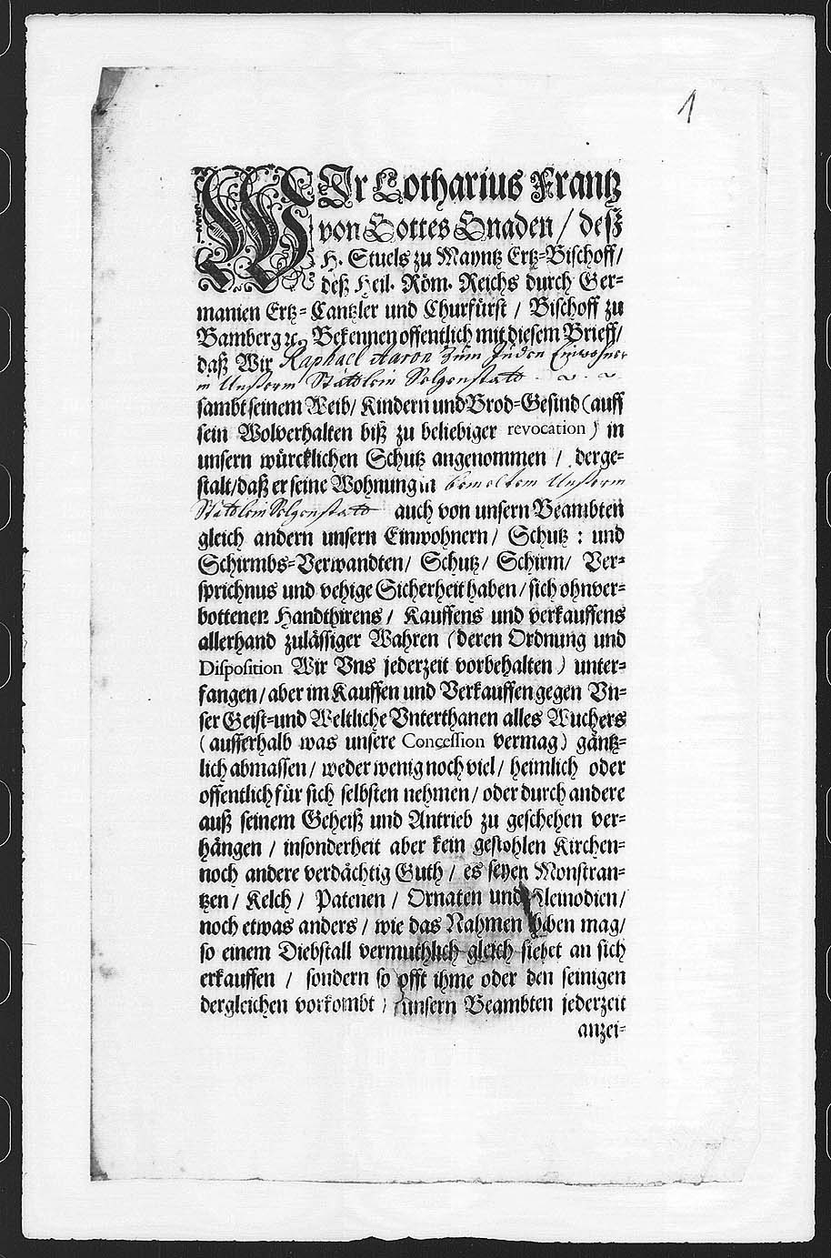 Schutzbrief des Mainzer Erzbischofs für den Juden Raphael Aron zu