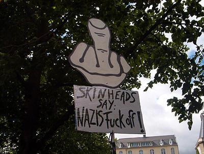 versammelt, die die Abreise der Nazis mit "Nazis raus!"-Rufen begleiteten.