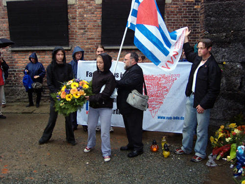 Übersetzung hatte auch das Transparent der VVN gebraucht. Auf englisch,