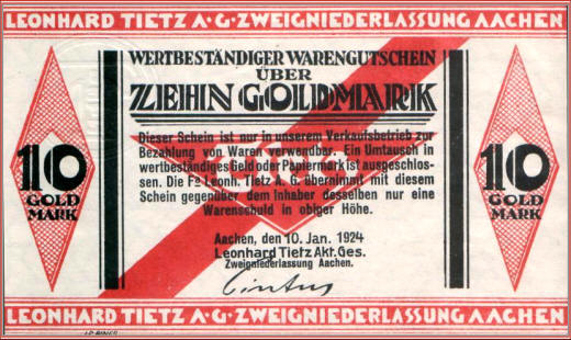 Wertbeständiges Notgeld der Firma Leonhard Tietz (hier Zweigstelle Aachen).