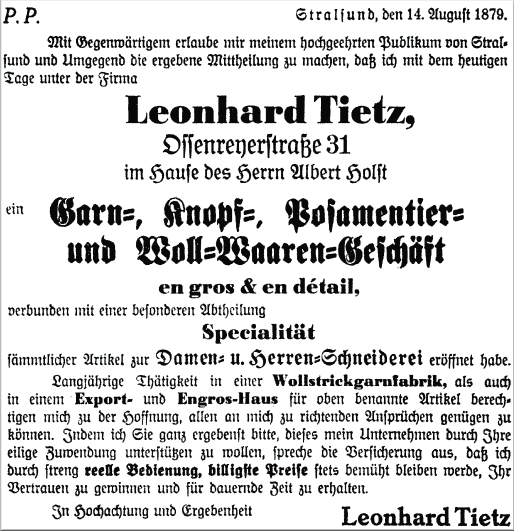 Leonhard Tietz. Er eröffnete in Stralsund ein kleines Textilgeschäft