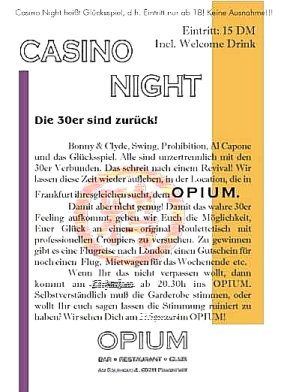 Diese neue Ära wollen wir mit einer gigantischen Party einleiten! In einem der angesagtesten Clubs in Frankfurt wird am 4.Shevat 5759 (das allgemeine Datum werdet Ihr schon rausfinden) unser CASINO eröffnet, mit einen original Roulette- und Black Jack Tisch, professionellen Croupiers, und Preisen die euch die Augen ausfallen lassen werden, und das ist keine Übertreibung (na gut, vielleicht ein bißchen). Zusätzlich haben wir den Haus-DJ für uns gewinnen können, der nicht nur professionell damit seine Brötchen verdient, sondern, und das ist noch viel wichtiger, in Fachkreisen bekannt ist (vergeßt also die laschen Parties mit irgendwelchen Freizeit-DJs). Und damit das ganze Feiern noch einen Sinn macht, geht ein Teil des Erlöses an haGalil onLine.