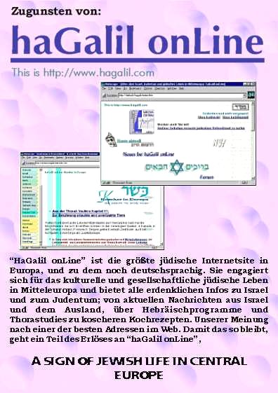Sie finden hier zahlreiche Artikel aus dem 90er Jahren, d.h. aus den Anfangsjahren des WWW. Aktuellere Meldungen finden Sie im Nachrichtenarchiv unter Jüdisches Leben in Deutschland..., Antisemitismus, Rechtsextremismus..., Europa und die Welt... oder in den täglich aktuellen Nachrichten von haGalil.com...