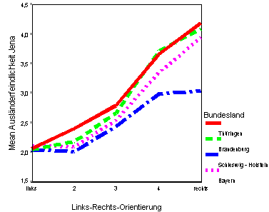 Auch die Interaktion zwischen regionaler Herkunft und Links-Rechts-Orientierung bedarf einer differenzierteren Betrachtung. Daß ausländerfeindliche Einstellungen quasi zum Ensemble rechter Orientierungen gehören, ist eine fast schon triviale Feststellung. Auch über die noch immer funktionierende Stabilität des Links-Rechts-Schemas als ideologischer Bezugsrahmen gibt es genügend Hinweise (vgl. z.B. Marx & Läge, 1995). Und so wundert das in der folgende Abbildung illustrierte Ergebnis zunächst nicht.