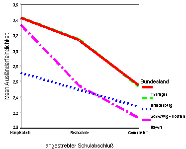Abb. 6: Interaktion zwischen Ausländerfeindlichkeit, regionaler Herkunft und angestrebtem Schulabschluß