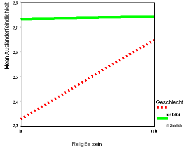 Religiosität fungiert im übrigen auch im Wechselspiel mit der Links-Rechts-Orientierung als Filter für Ausländerfeindlichkeit. Darauf verweist die Interaktion zwischen diesen beiden Variablen, auf deren Illustration ich aber an dieser Stelle verzichte. Rechte religiöse Jugendliche äußern sich weniger ausländerfeindlich als rechte nichtreligiöse Jugendliche.