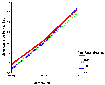 Die oben dargestellte Varianzanalyse zeigt nun, daß es eine Interaktion zwischen Autoritarismus (im von uns operationalisierten Sinne) und der familiären Unterstützung zu geben scheint, auch wenn diese Interaktion auf einem recht geringen Niveau signifikant ist. Abb. 8 illustriert, daß diese Interaktion tatsächlich kaum interpretierbar ist.