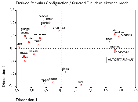 In einem ersten Schritt unterzogen wir die Sympathie/Antipathie-Urteile der Befragten einer Multidimensionalen Skalierung (R-MDS), wodurch wir eine "Landkarte" der Jugendkulturen erhielten.