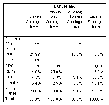 Während in Schleswig-Holstein 45,5% der "rechten" Jugendlichen CDU wählen würden, sind es in Thüringen nur 21,8%, in Brandenburg 0% und in Bayern 15,2%. Dagegen würden in Thüringen, Brandenburg und Bayern zwischen 14,5% und 25% dieser Jugendlichen die REPs wählen, wohingegen in Schleswig-Holstein kein Jugendlicher diese Partei zu präferieren scheint. Auch im Hinblick auf die PDS-Präferenzen und die potentielle Wahlverweigerung unterscheiden sich die Thüringer, Brandenburger und Bayern von den Schleswig-Holsteinern. Vielleicht - so wäre zu vermuten - ist das "Rechts-Sein" der Schleswig-Holsteiner Jugendlichen eher mit konservativen und traditionellen politischen Konstruktionen verknüpft. Dagegen wären die "rechten" Orientierungen der Jugendlichen aus den drei anderen Bundesländern stärker als Ausdruck eines politischen Extremismus gegenüber etablierter Politik zu interpretieren.