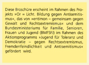 2002] Diese Broschüre erscheint im Rahmen und mit Mitteln des Projekts »Or = Licht. Bildung gegen Antisemitismus«, das von »entimon - gemeinsam gegen Gewalt und Rechtsextremismus« und dem Bundesministeriums für Familie, Senioren, Frauen und Jugend (BMFSFJ) im Rahmen des Aktionsprogramms »Jugend für Toleranz und Demokratie - gegen Rechtsextremismus, Fremdenfeindlichkeit und Antisemitismus« gefördert wird.